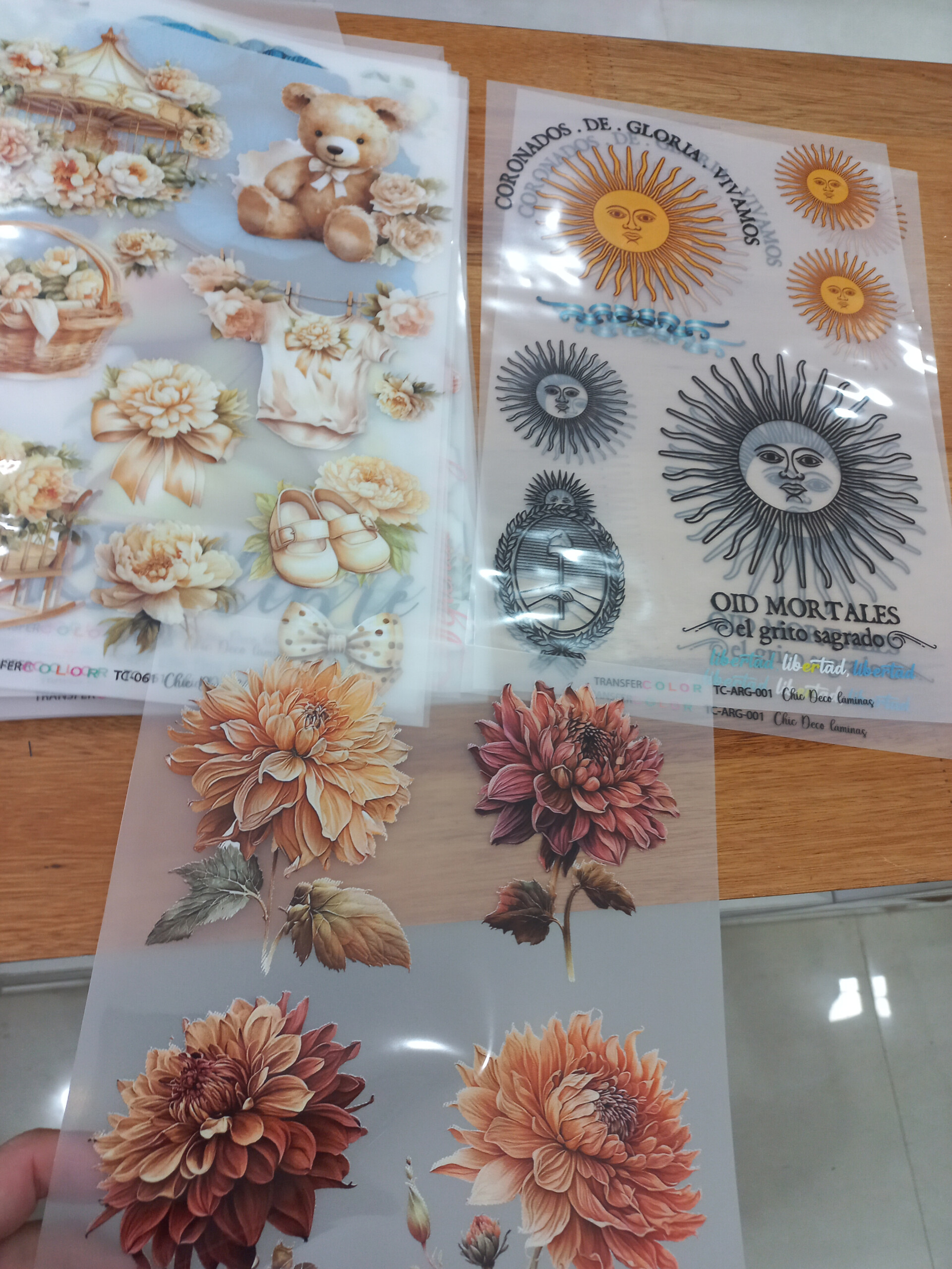 Láminas ideal para adherir en todo tipo de superficie con plancha y calor adhiere a papel madera tela etcétera y con multitac o multipropósito adhiera vidrio o a cualquier tipo de soporte.